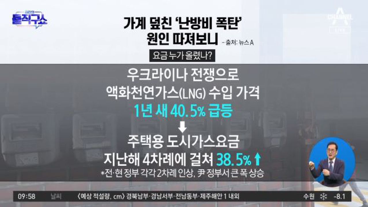 역대급 한파가 지속되고 있는 지금, 난방비 폭탄으로 많은 사람들이 생계의 부담을 겪고 있습니다. 가계를 덮친 난방비 폭탄의 원인으로는 세가지를 꼽을 수 있습니다. 러시아와 우크라이나의 전쟁으로 인해 액화천연가스(LNG) 수입 가격이 1년 사이 40.5%가 급등한 것, 두 번째로는 주택용 도시가스 요금이 지난해 4차례에 걸쳐 38.5%가 상승한 것, 올 겨울철 강력해진 한파로 인해 난방 수요가 대폭 늘어난 것 때문입니다. 실질 인상 폭은 50% 이상으로 추정됩니다.